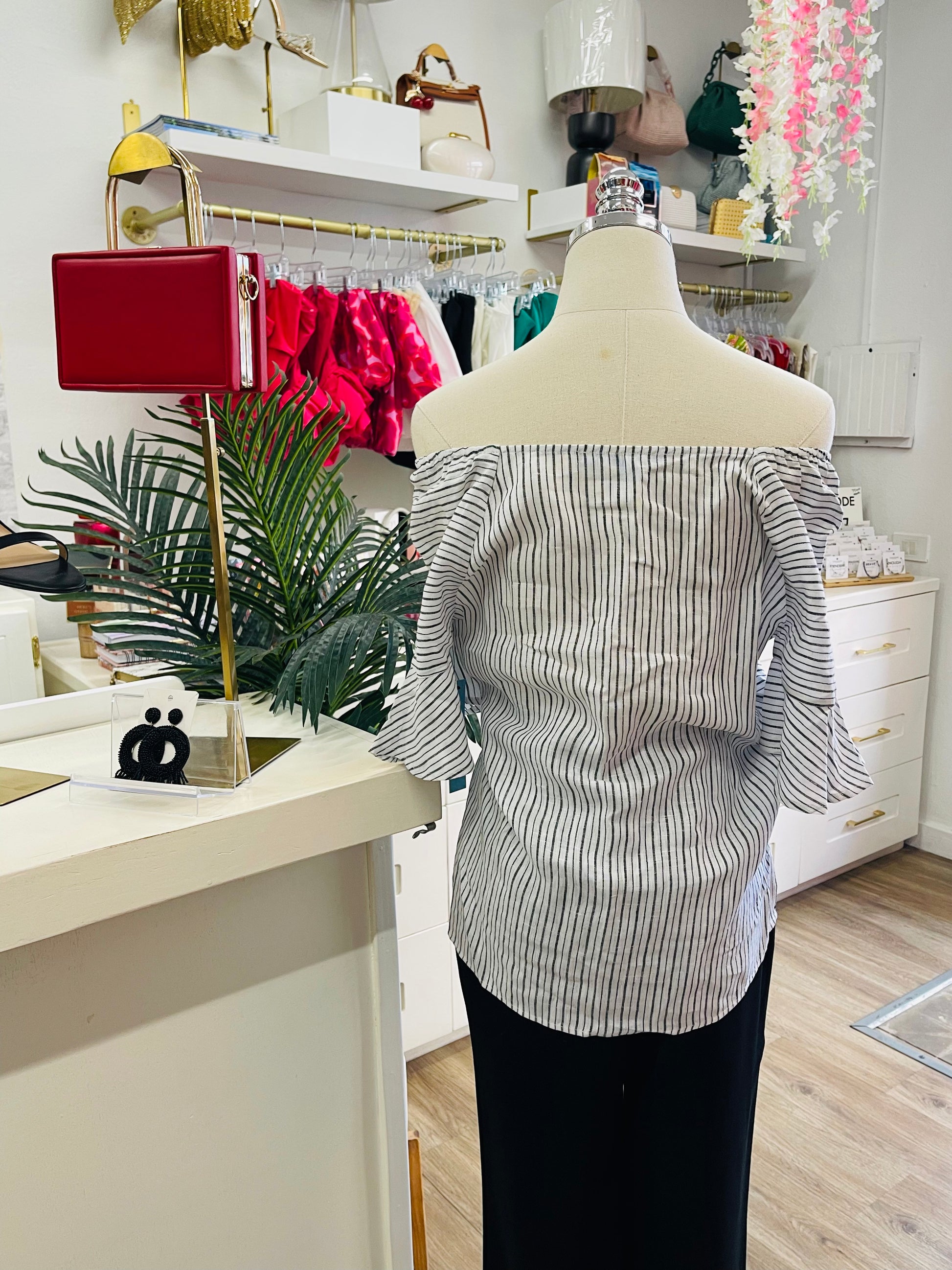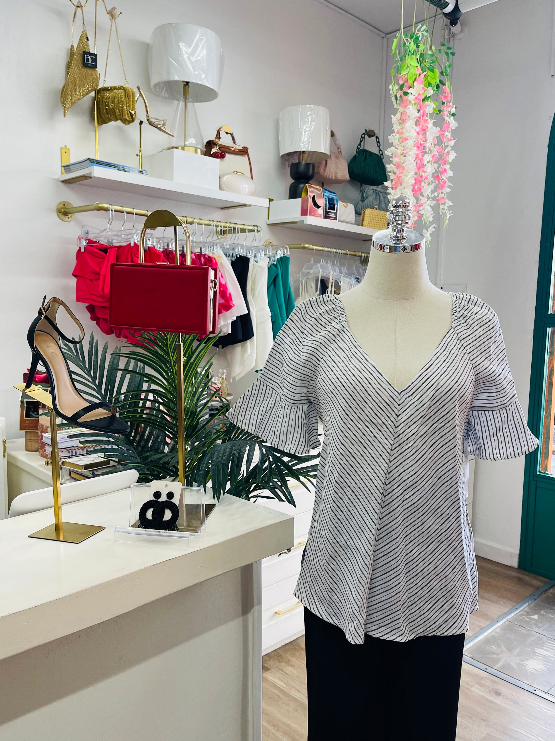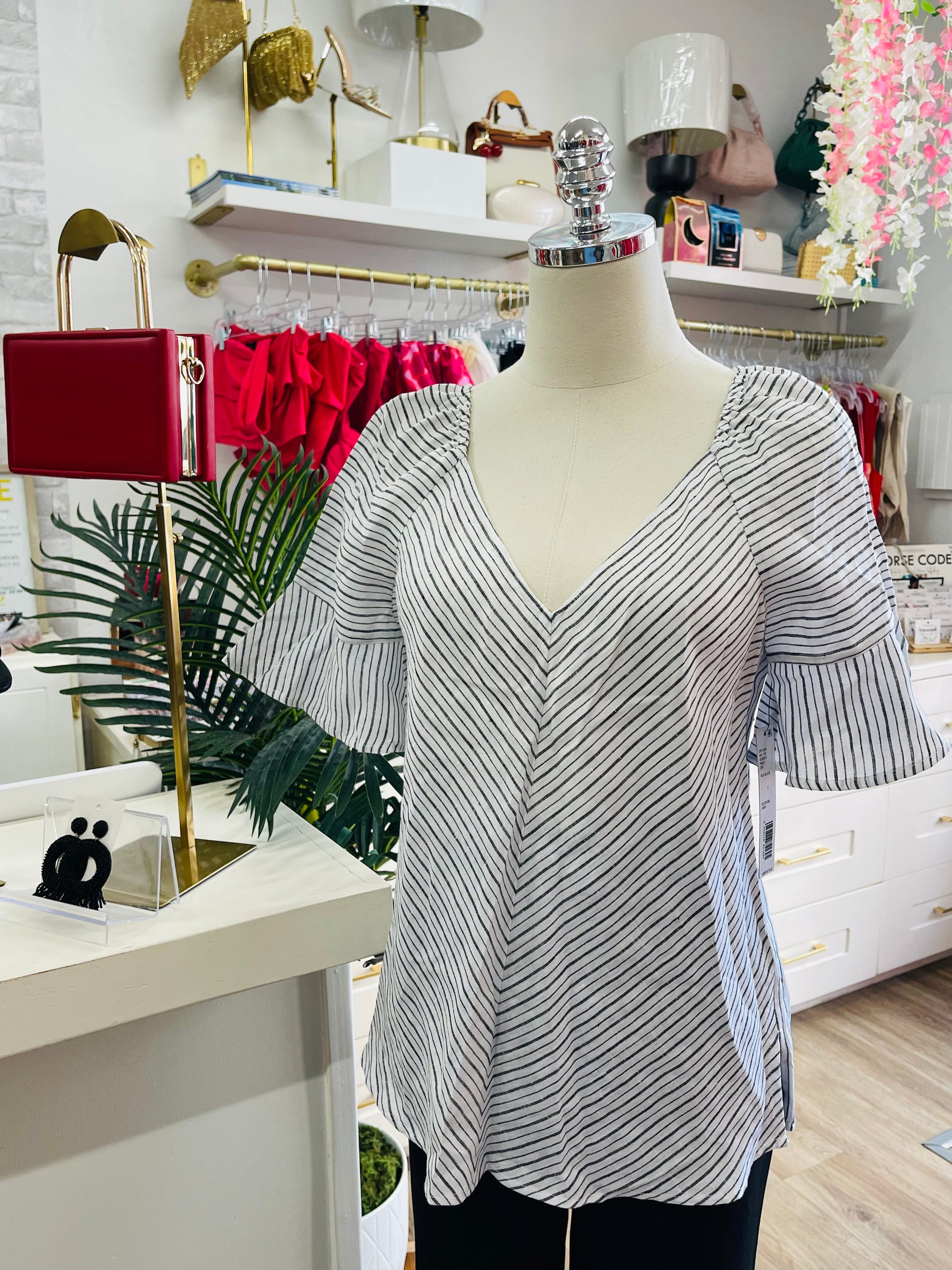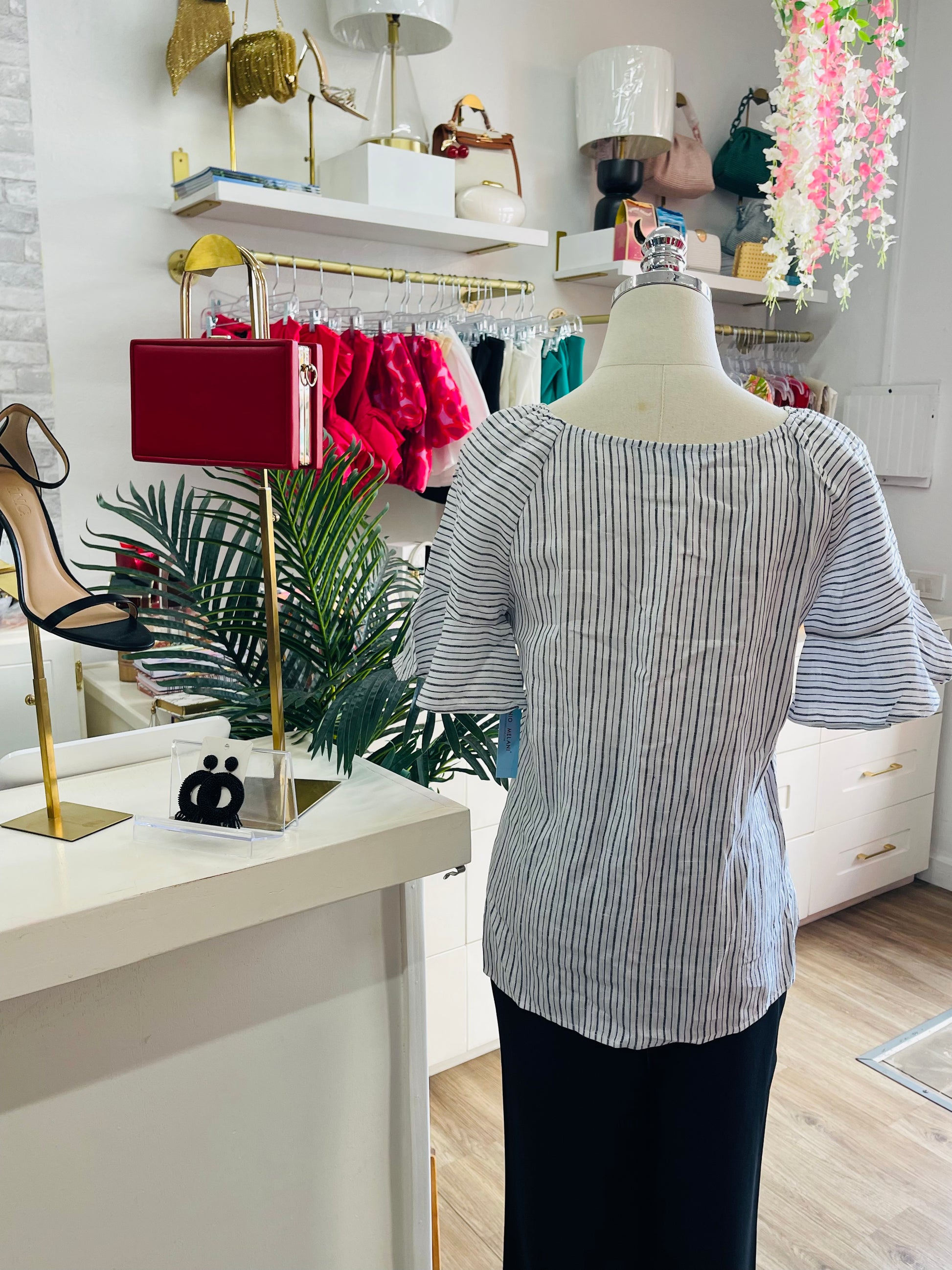 Elevate your wardrobe with the AM Finley Top, featuring a flattering V-neck and delicate ruffle detail for a touch of feminine charm. Crafted from breathable linen, it ensures comfort and style during warmer days. The short sleeves add a relaxed yet polished look, making it perfect for both casual outings and dressier occasions. Embrace effortless elegance with this versatile essential.
