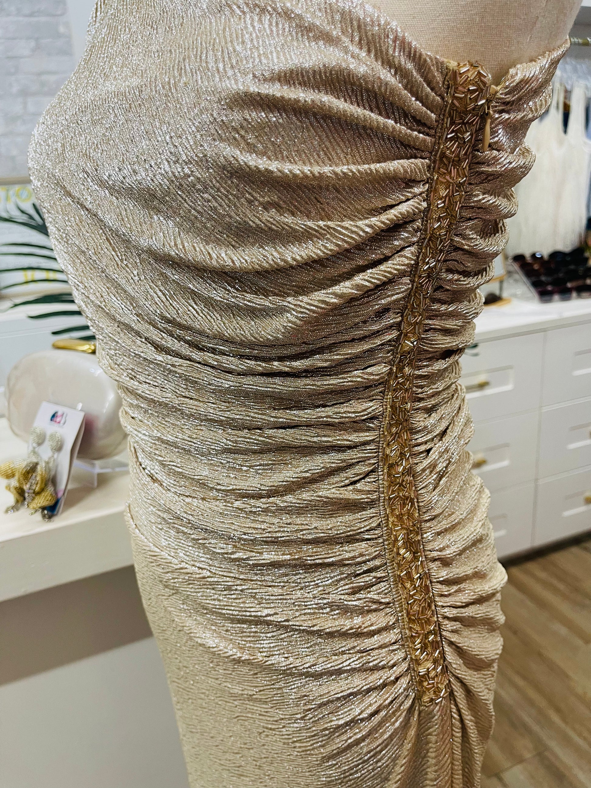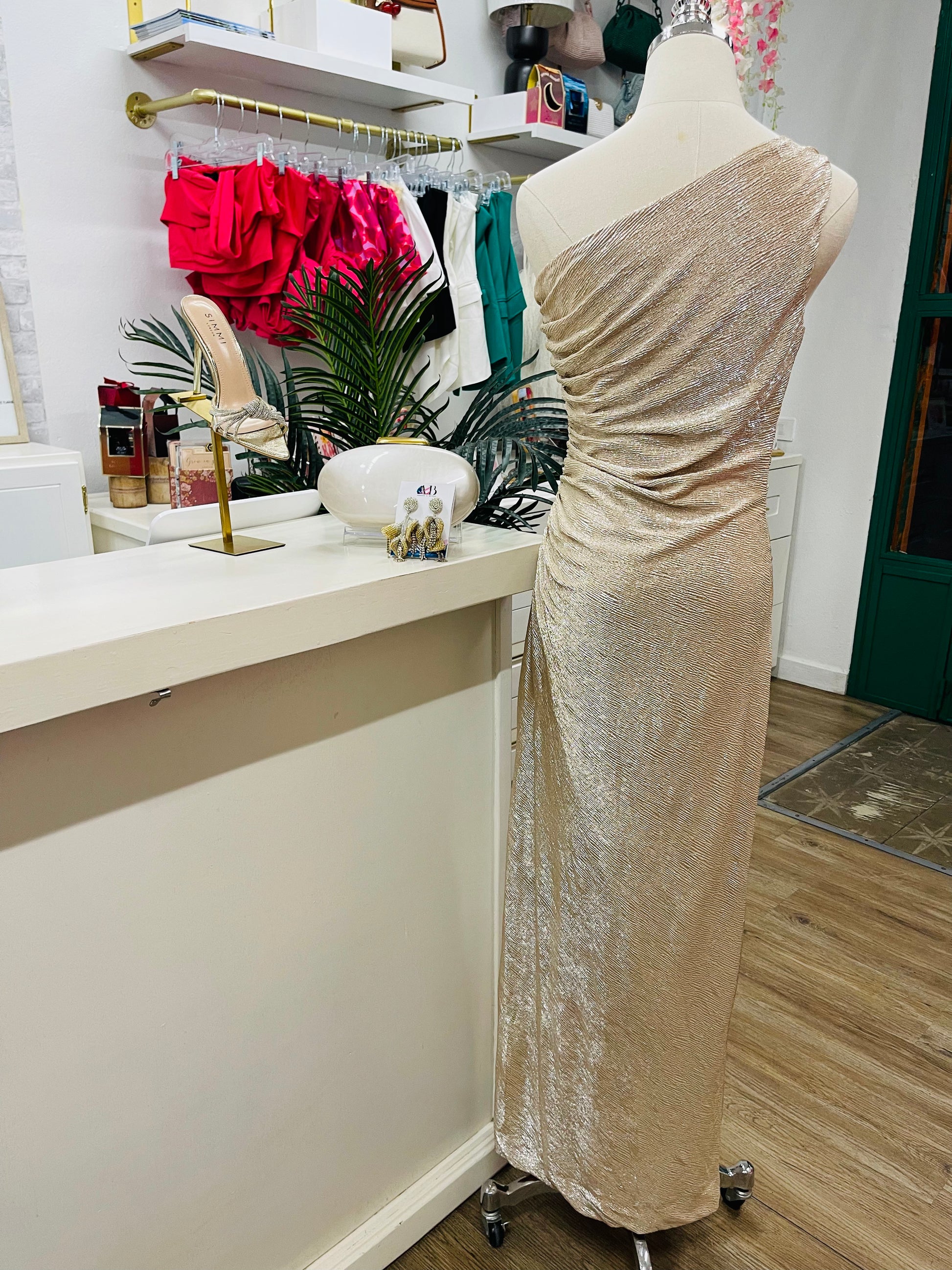 Elevate your evening with the CK Fifi One Shoulder Gown, featuring a radiant shimmery gold fabric that catches every light. Its elegant one-shoulder design offers a modern, flattering silhouette perfect for special occasions. Step into sophistication and shine with confidence in this striking gown.