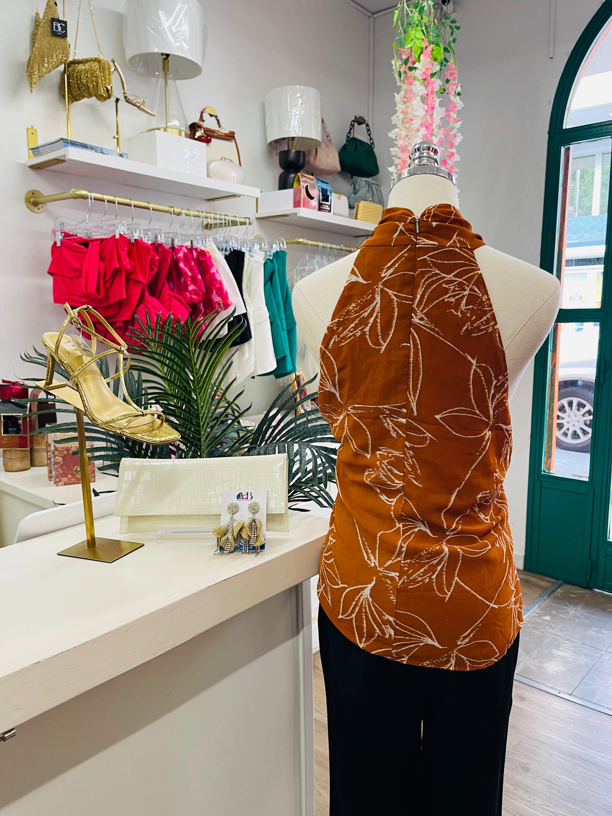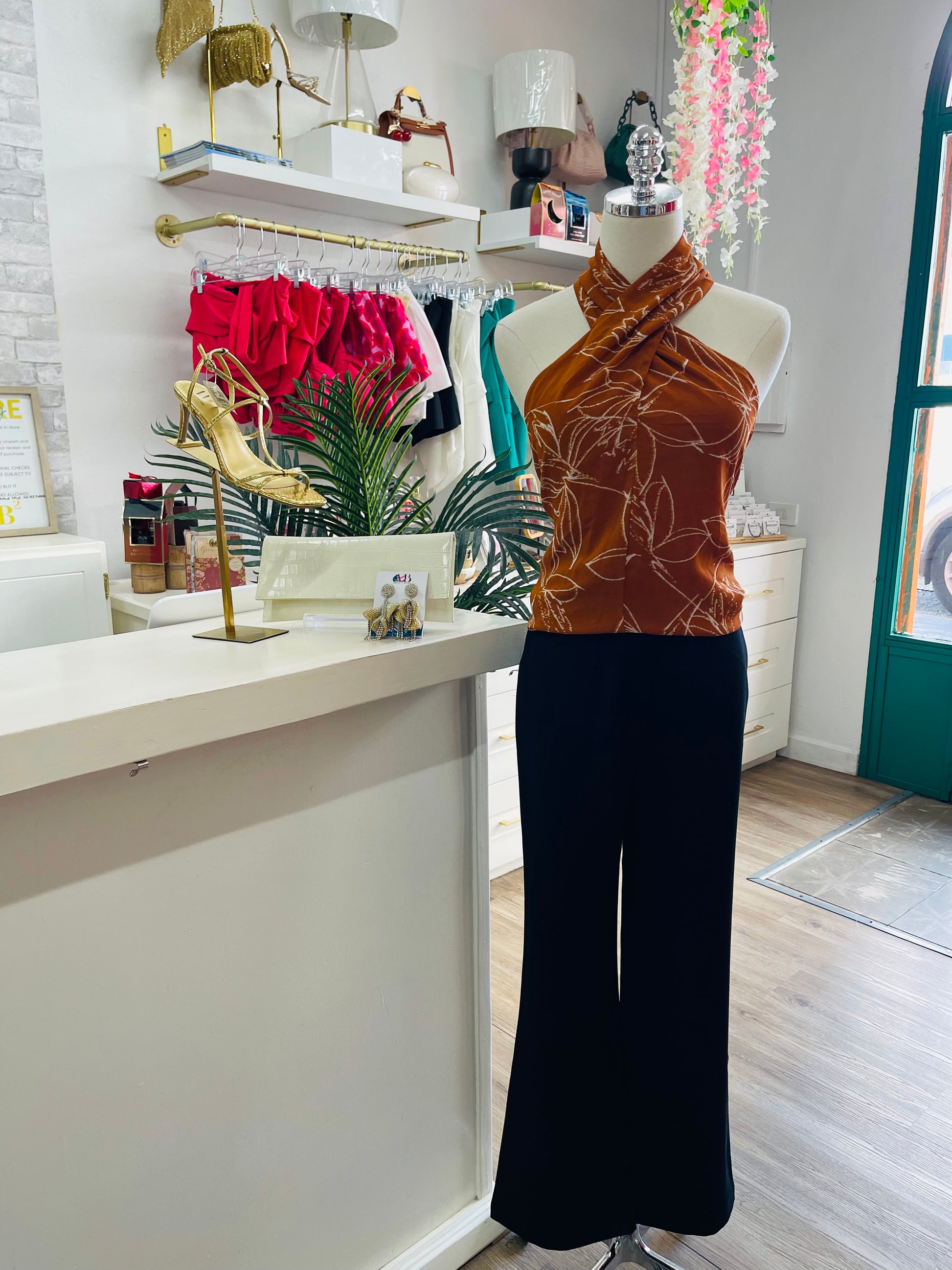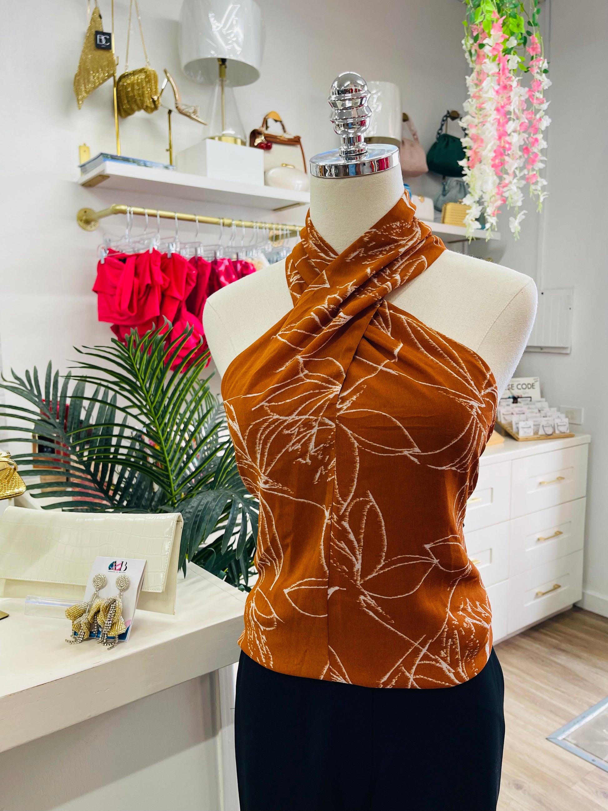 Elevate your style with the CK Oak Halter Top in a rich rust hue that complements any sultry look. Its sleek halter design highlights your neckline while offering a flattering fit that moves with you. Perfect for day-to-night wear, this top pairs effortlessly with your favorite jeans or skirts, making it a versatile addition to your wardrobe. Embrace warmth and confidence with this effortlessly chic piece.