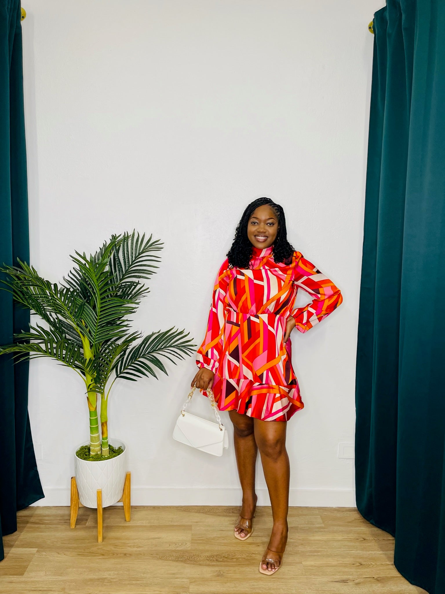 Stay fashionable and cozy with the Fate High Neck LS Ruffle Hem Geo Dress. This dress features a high neck and ruffle hem, adding a touch of elegance to the modern geometric design. Perfect for any occasion, this dress will make you stand out in style and comfort.