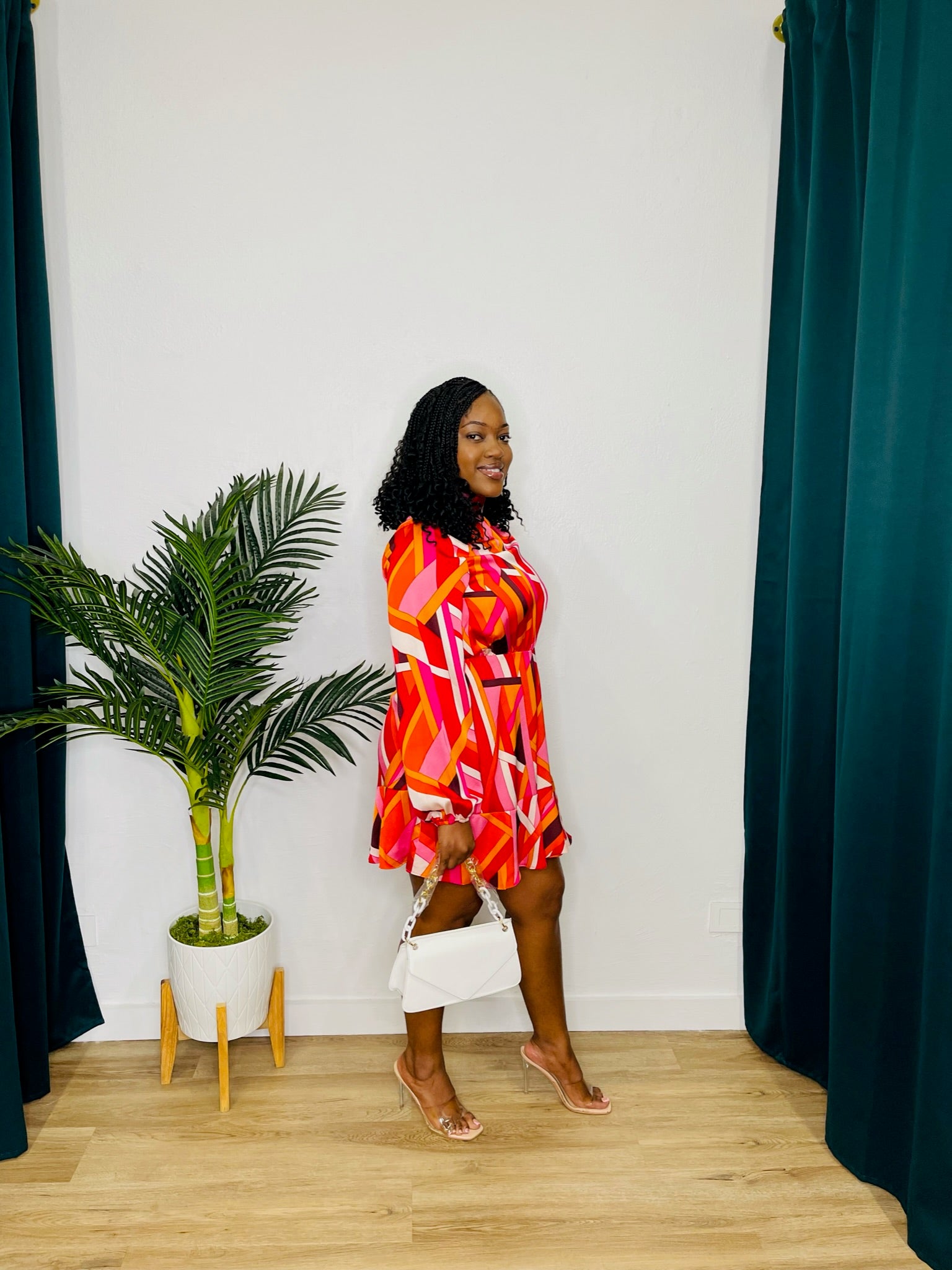 Fate High Neck LS Ruffle Hem Geo Dress