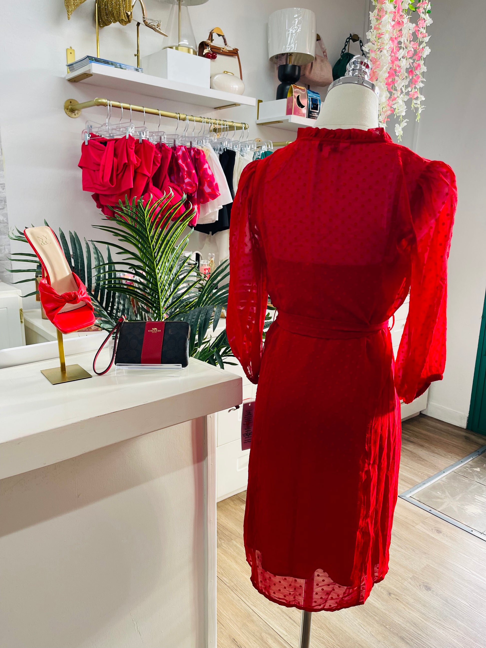 Elevate your wardrobe with the Nanette Riding Hood Dress, featuring delicate swiss dots on a long-sleeve silhouette for timeless charm. The belted waist cinches to flatter your figure while the shift design ensures comfort and effortless style. Perfect for day-to-night wear, this dress blends classic elegance with modern ease.