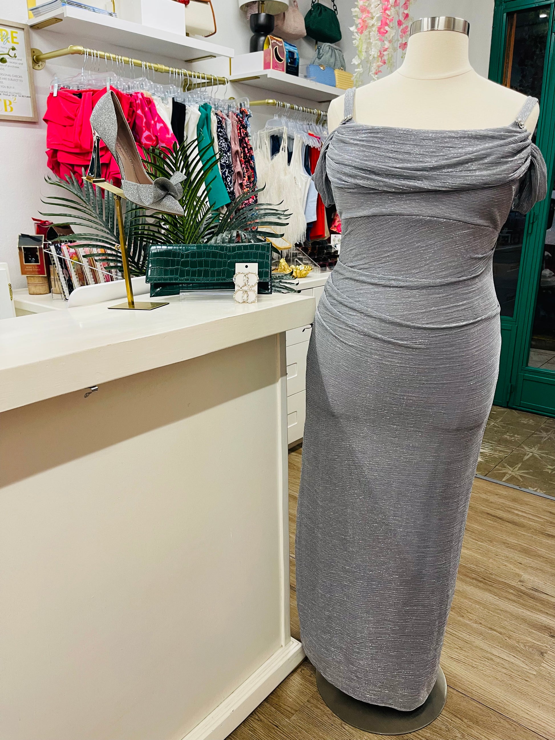 Elevate your evening look with the R&MR Metallic Gown, a stunning silver mesh dress featuring an elegant off-shoulder design. Its shimmering fabric catches the light beautifully, creating a sophisticated and graceful silhouette perfect for special occasions. Comfortable yet striking, this gown ensures you stand out with timeless glamour.