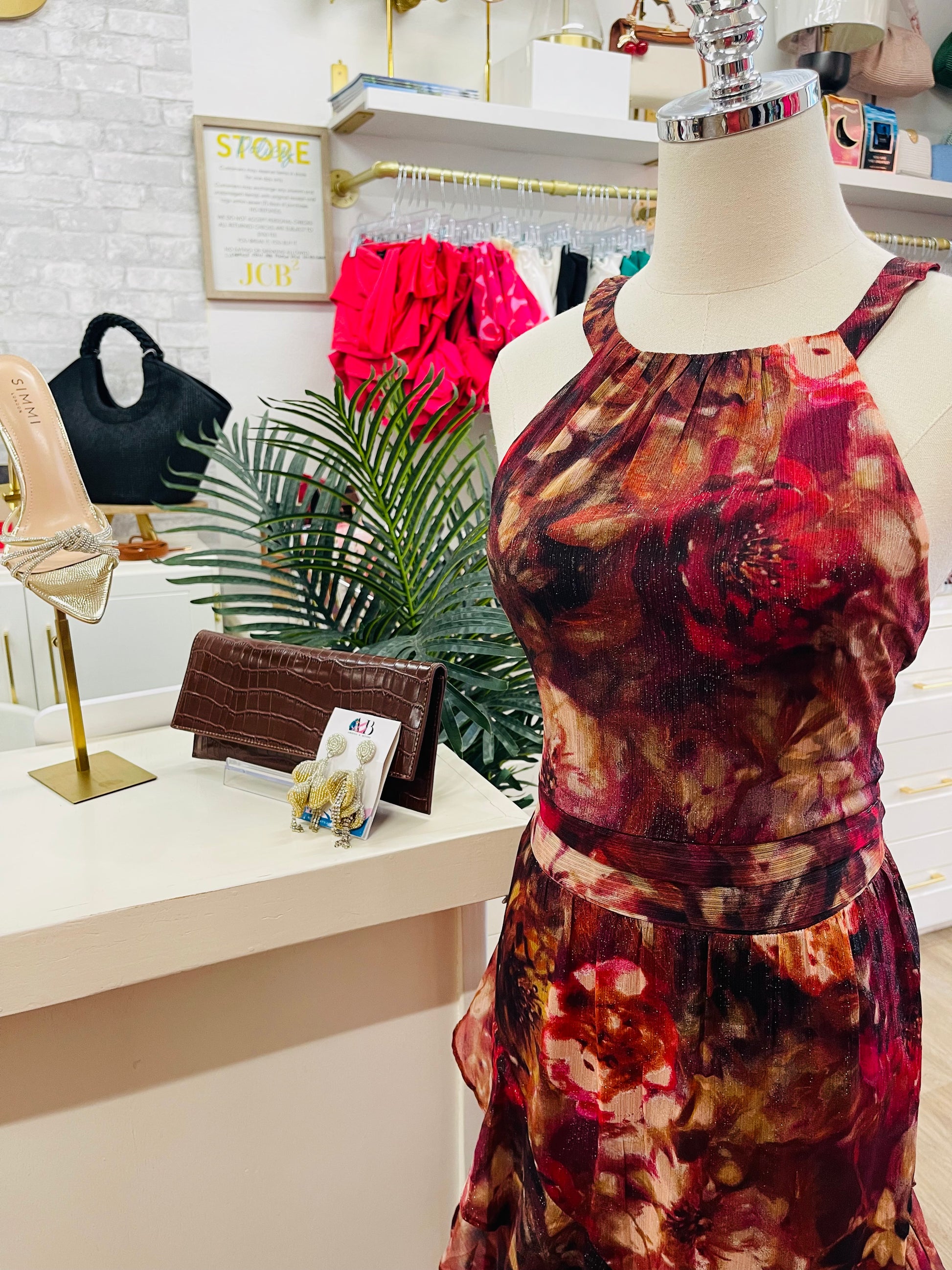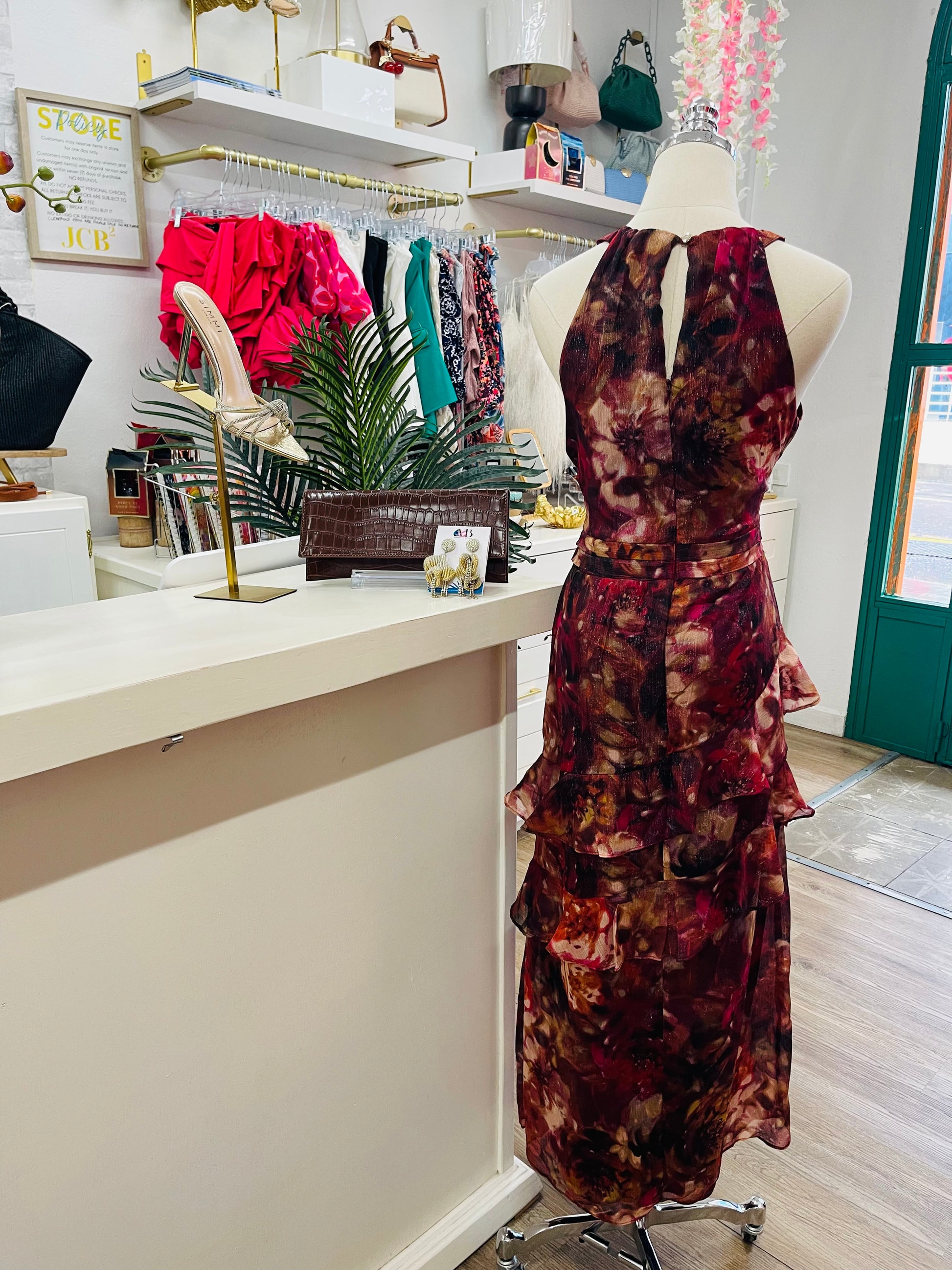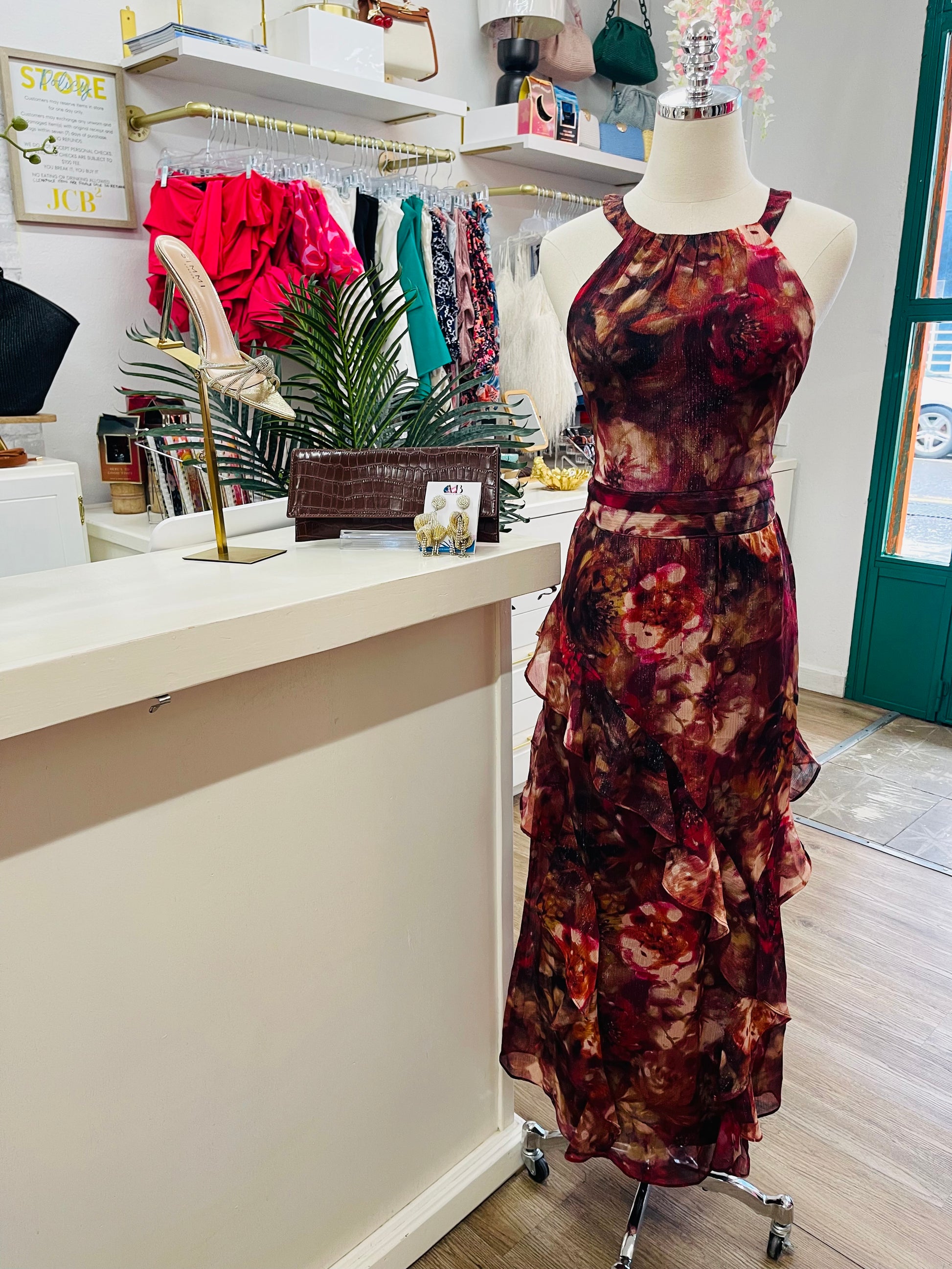 Elevate your evening look with the S&J Metallic Gown, featuring a stunning halter neckline and tiered ruffle details that add dynamic movement. The beautiful print enhances its metallic sheen, making it perfect for special occasions where you want to shine. This gown combines elegance with a touch of drama, ensuring you stand out effortlessly.
