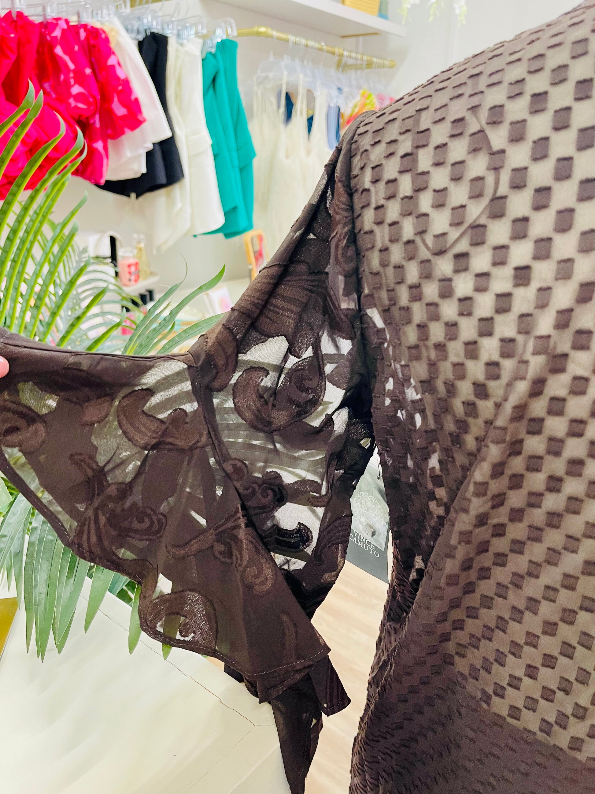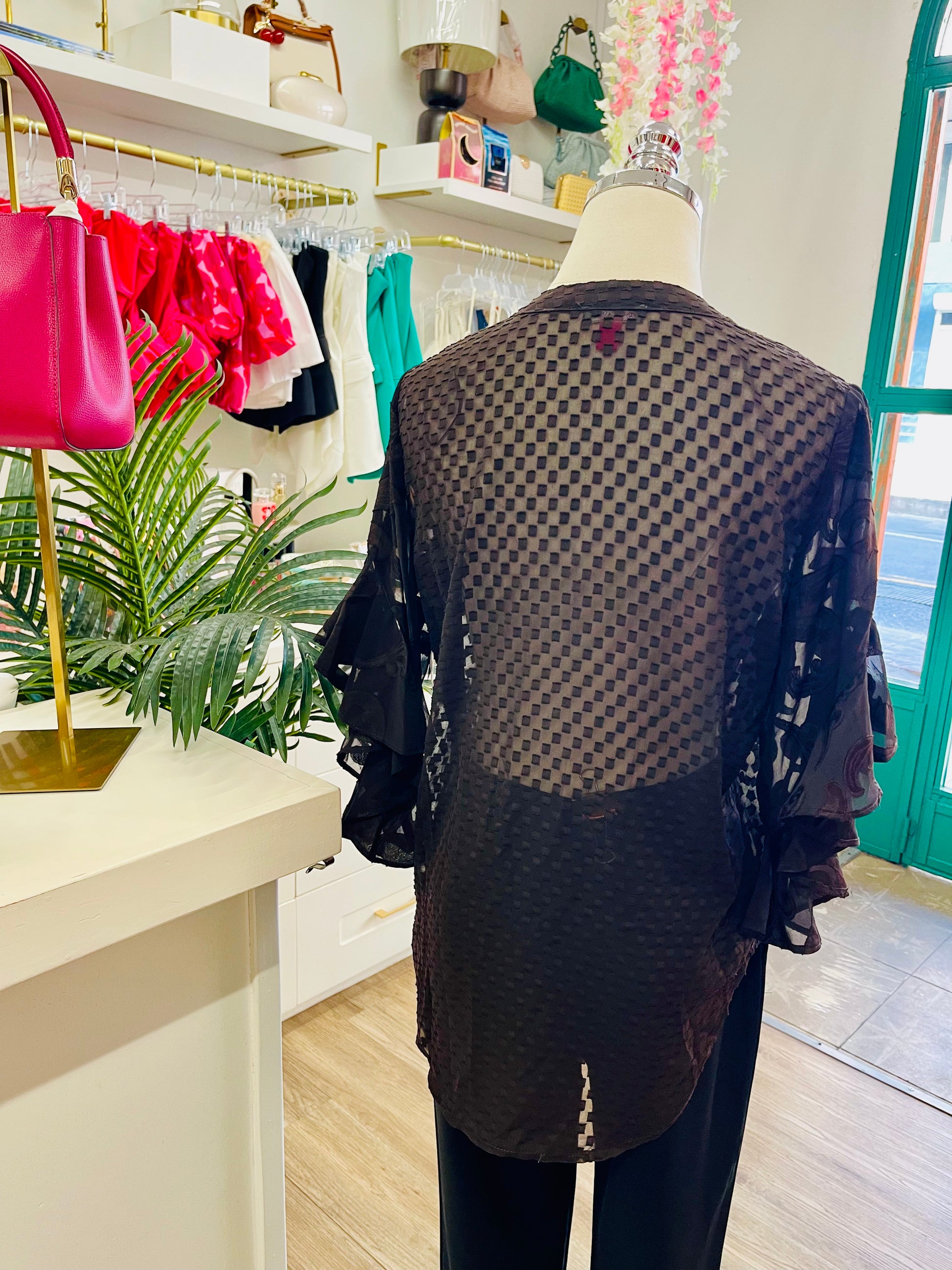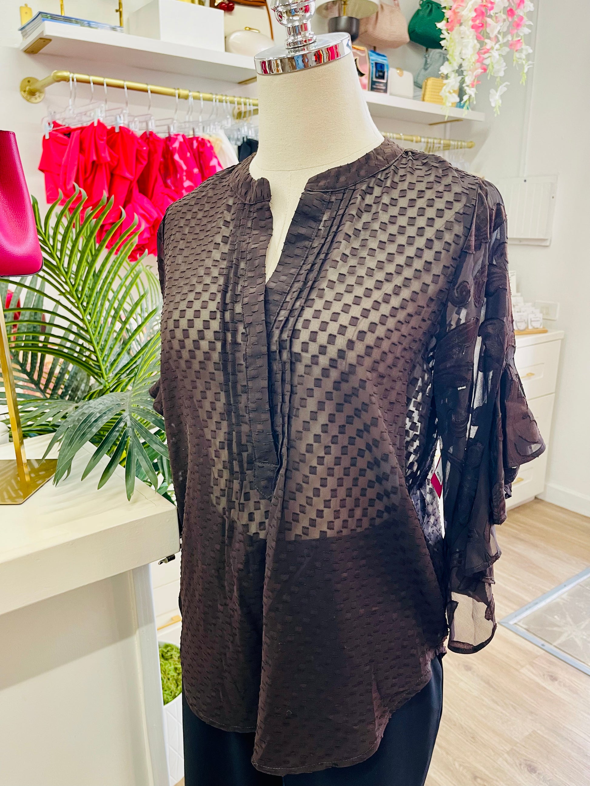 Embrace effortless elegance with the VC Off Grid Top, featuring delicate sheer fabric and eye-catching flutter sleeves that add movement and dimension to your wardrobe. The versatile 3/4 length sleeves strike the perfect balance between coverage and style, making this piece ideal for layering or wearing solo. Whether you're dressing up for an occasion or elevating your everyday look, this top delivers sophisticated charm with a modern twist. The lightweight, breathable construction keeps you comfortable all day long, while the unique flutter detail ensures you'll stand out from the crowd.