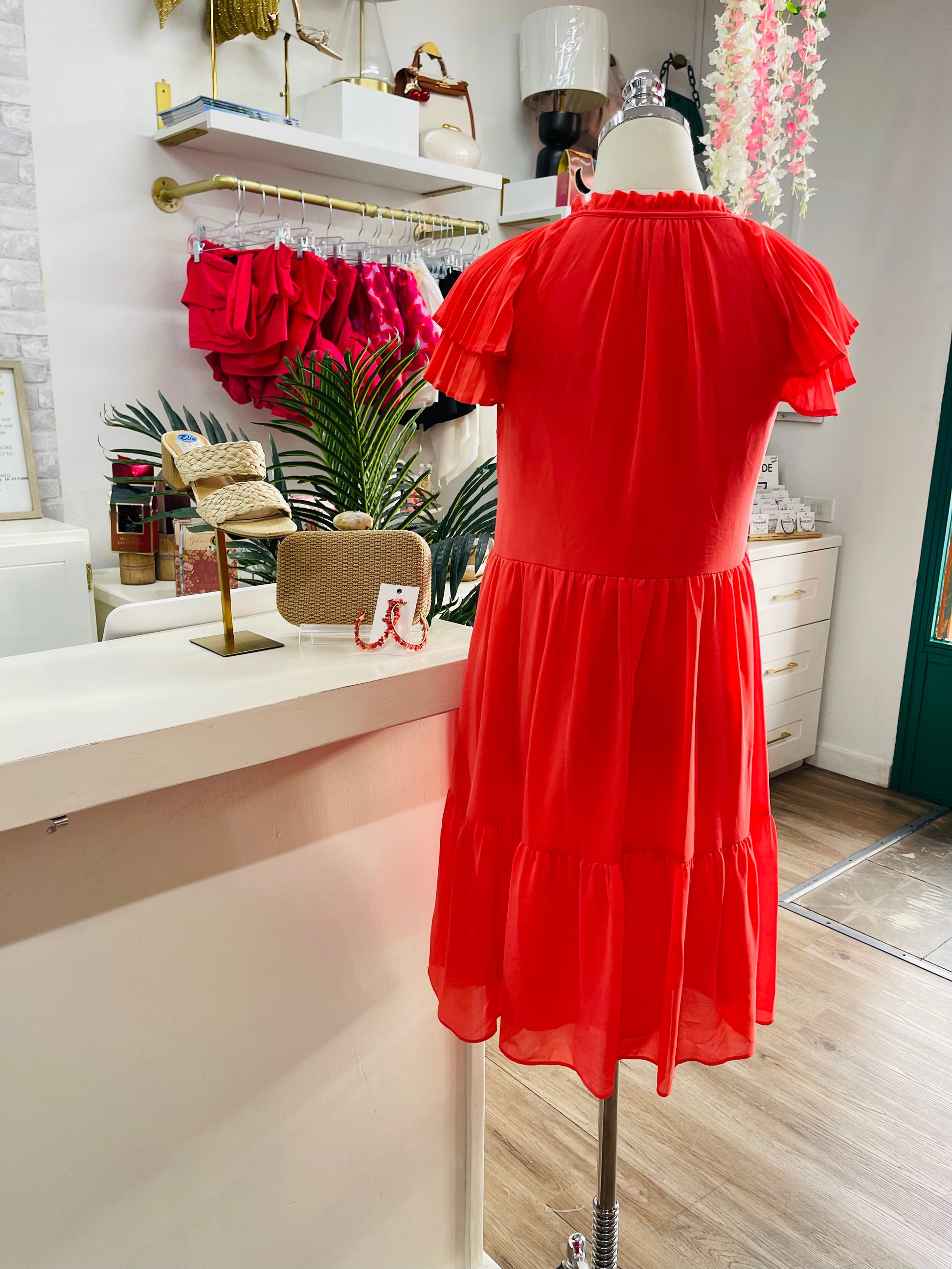 The VC Cali Shift Dress features a flattering V-neck and a stylish tie-neck detail that adds a touch of elegance. Its flutter sleeves create a soft, feminine silhouette while providing comfortable movement throughout the day. Ideal for both casual outings and more polished occasions, this dress combines effortless style with versatile wearability.